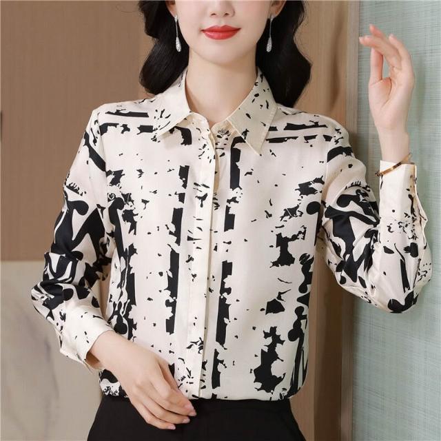 免運 桑蠶絲長袖襯衫洋氣印花上衣中年女士時尚翻領真絲襯衣女