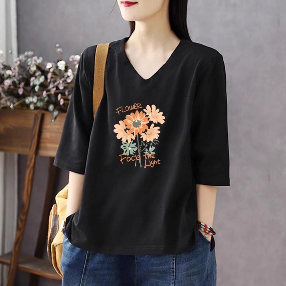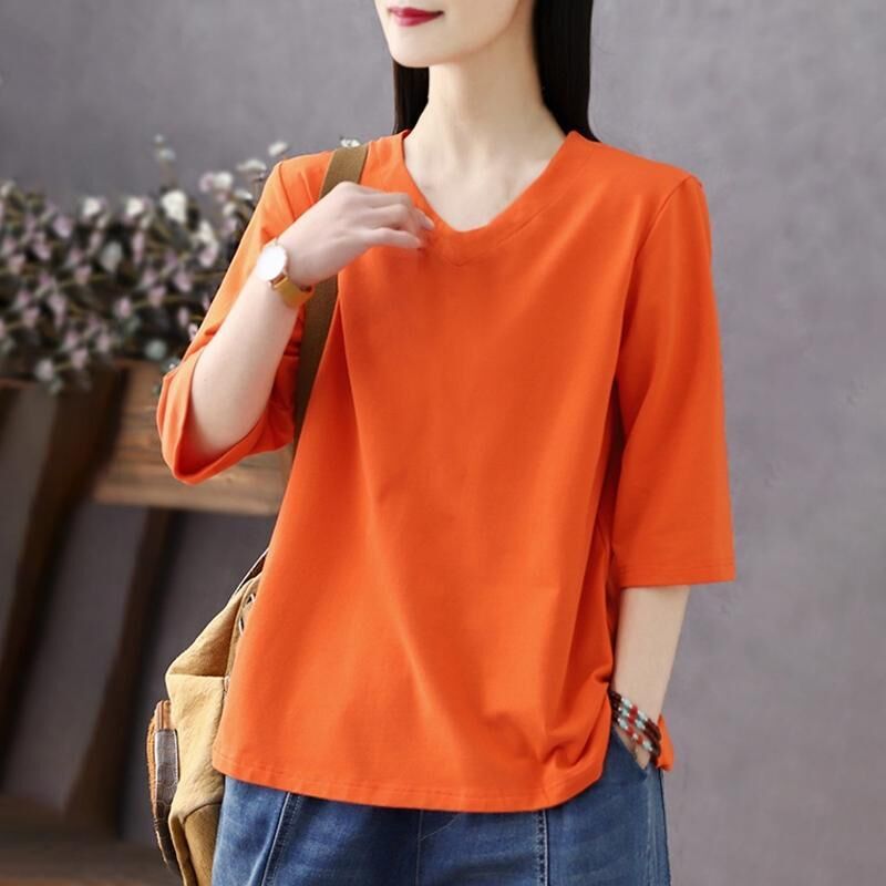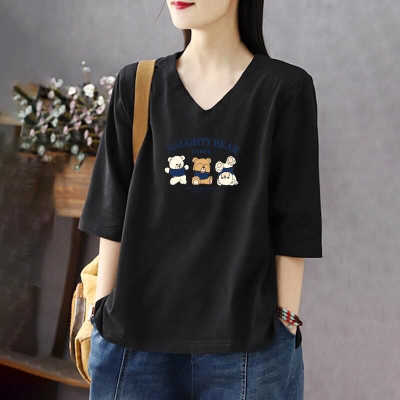 免運 純色棉短袖t恤女2026夏新款休閒時尚百搭棉卡通七分袖打底衫