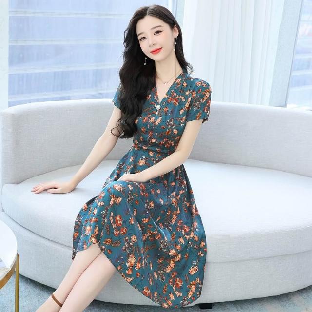 免運 媽媽夏裝V領時尚連衣裙母親節中老年女洋氣短袖裙子氣質碎花