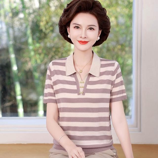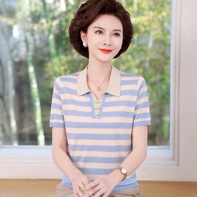 免運 中老年女夏黑白條紋短袖T恤寬鬆翻領大碼中年薄款休閒上衣媽媽裝