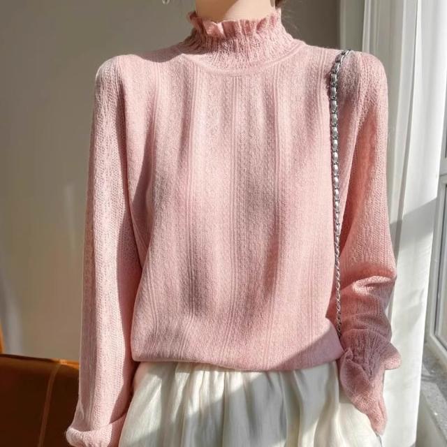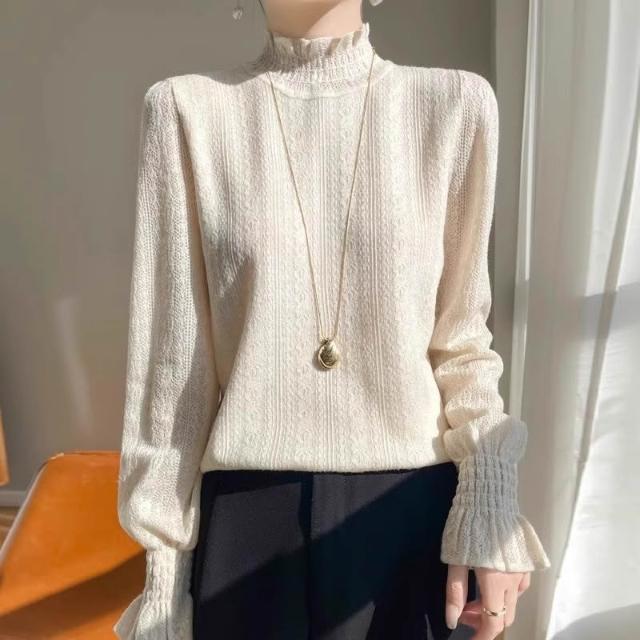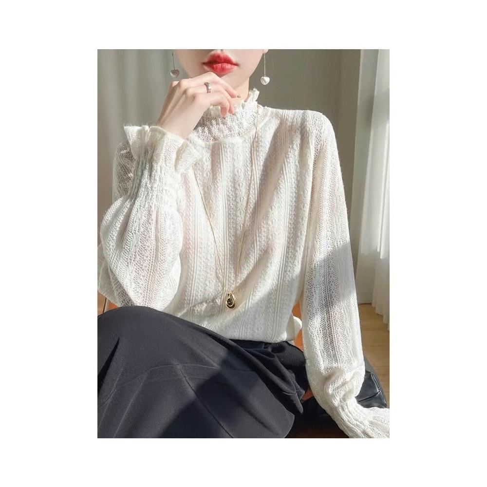 小香風薄款白色蕾絲小衫半高領打底衫內搭毛衣鏤空溫柔木耳邊上衣