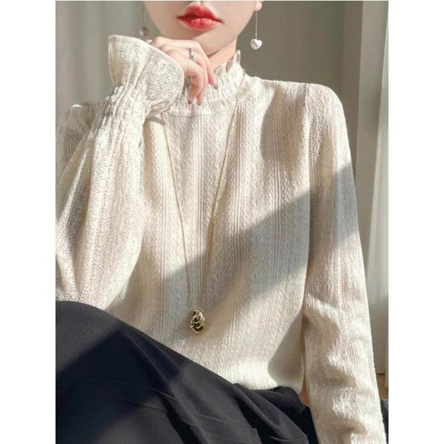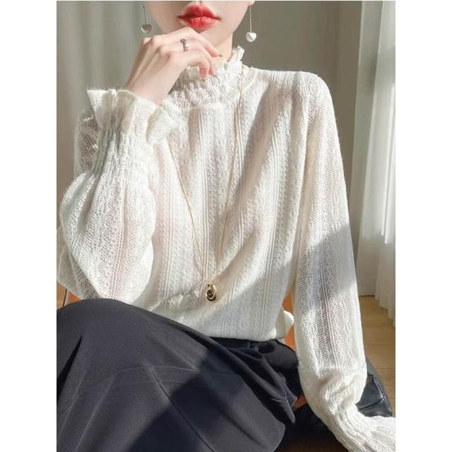 小香風薄款白色蕾絲小衫半高領打底衫內搭毛衣鏤空溫柔木耳邊上衣