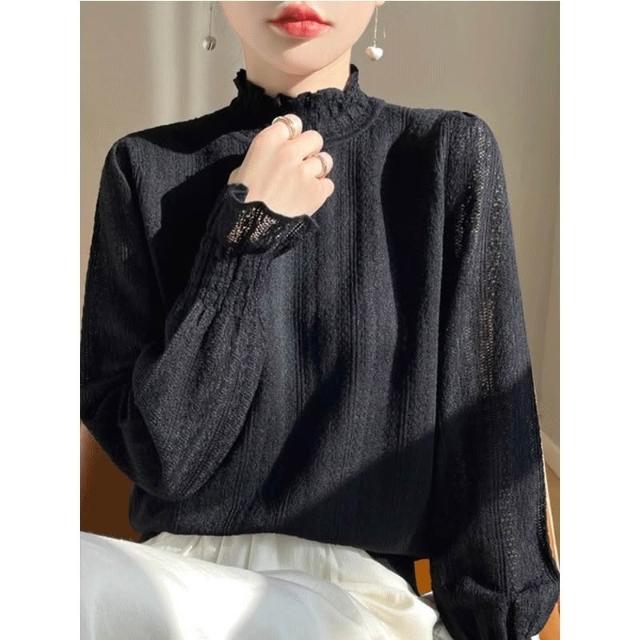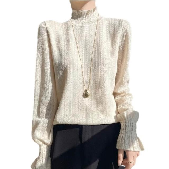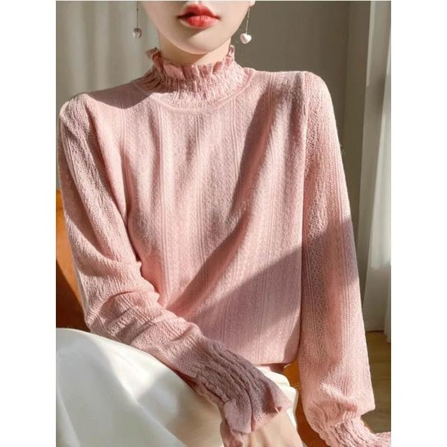 小香風薄款白色蕾絲小衫半高領打底衫內搭毛衣鏤空溫柔木耳邊上衣