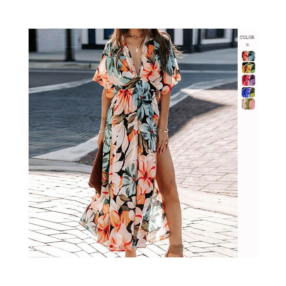 2025亞馬遜跨境夏季歐美女裝新款性感高腰時尚印花開叉連衣裙女