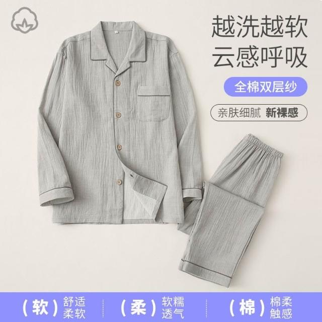 免運春秋全棉雙層紗布縐紗日系簡約男士長袖短袖睡衣套裝純棉家居服