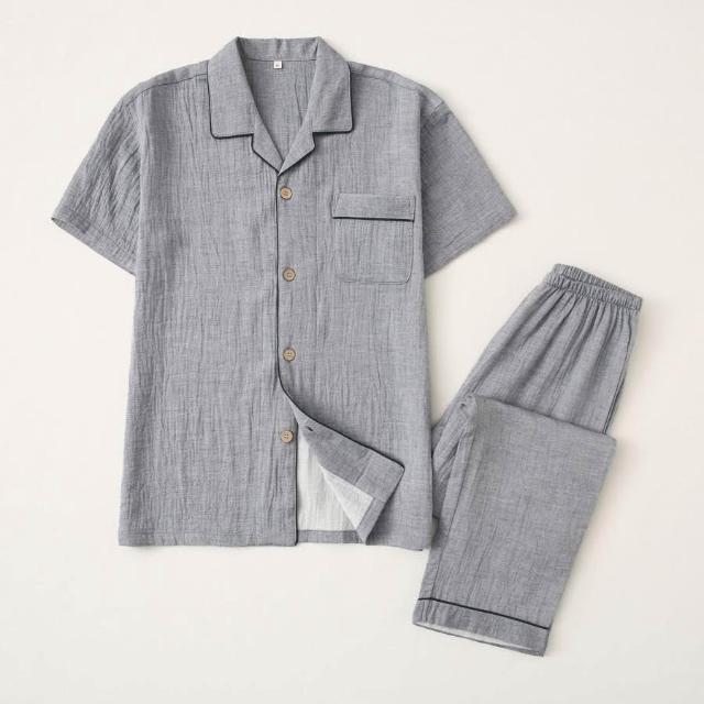 免運春秋全棉雙層紗布縐紗日系簡約男士長袖短袖睡衣套裝純棉家居服