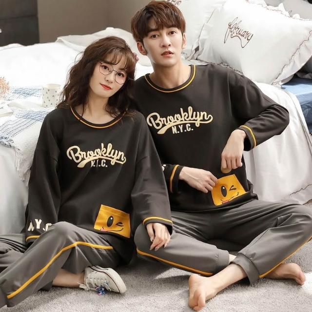 免運春秋季跨境爆款純棉情侶睡衣男長袖女士圓領套頭家居服套裝可外穿