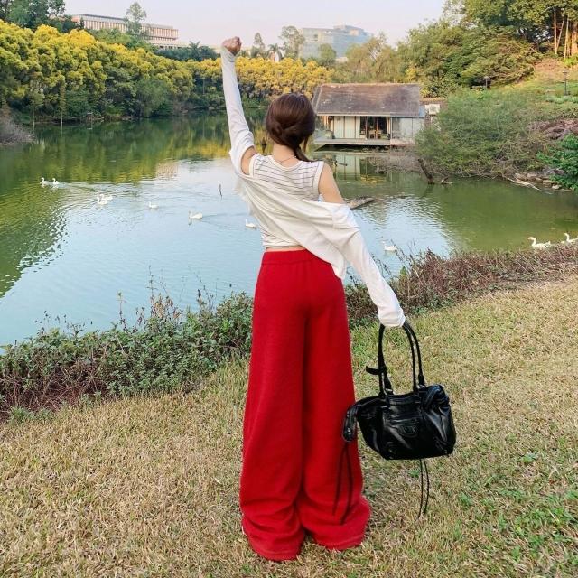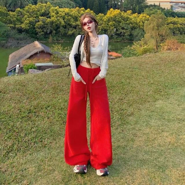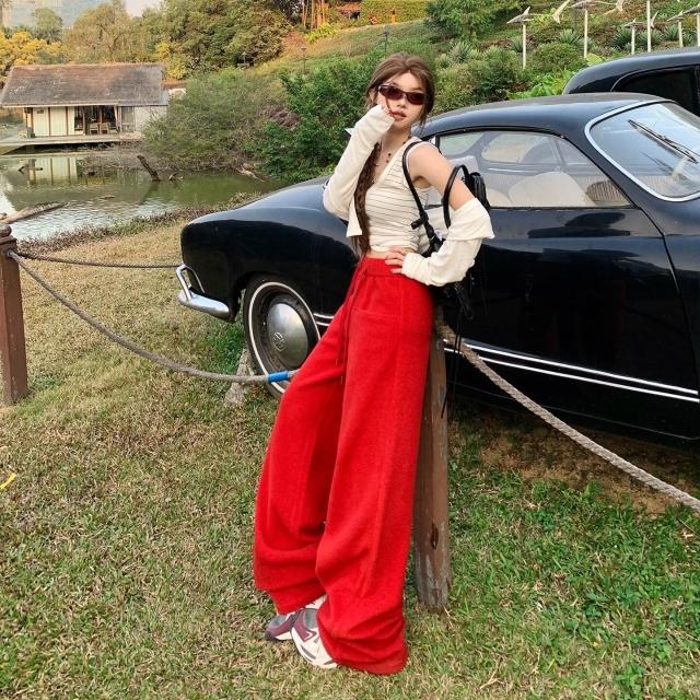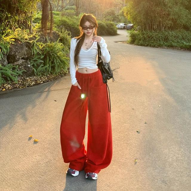 漫語 懶風紅色衛褲女2026春秋季寬松顯瘦拖地休閑褲高腰直筒闊腿褲子女