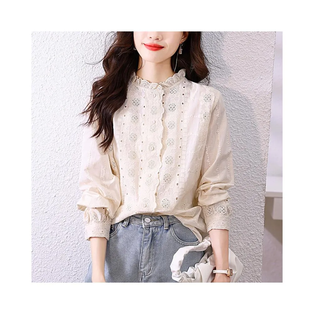 漫語 女式襯衫2026春裝新款蕾絲花邊木耳領杏色上衣長袖刺繡花純棉襯衣