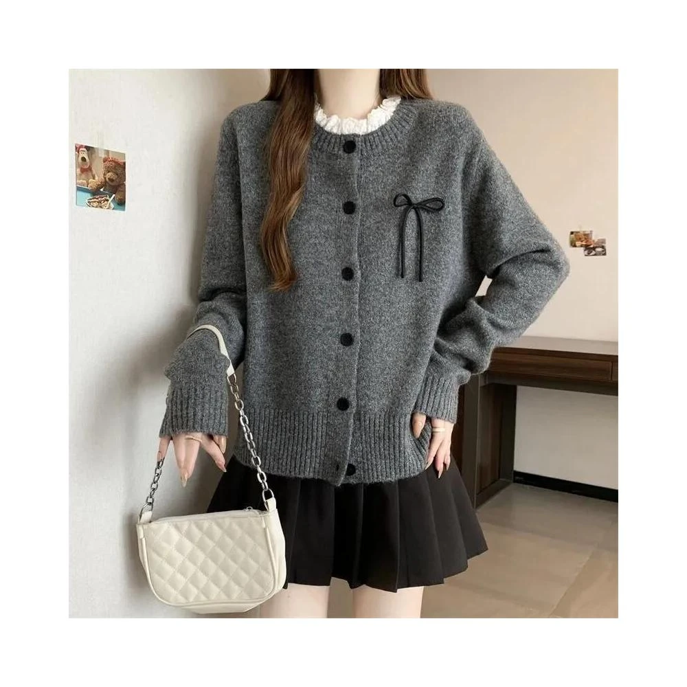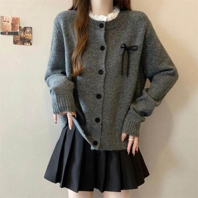 漫語· 復古慵懶風蕾絲花邊拼接灰色毛衣女秋冬款別致洋氣圓領紐扣針織衫