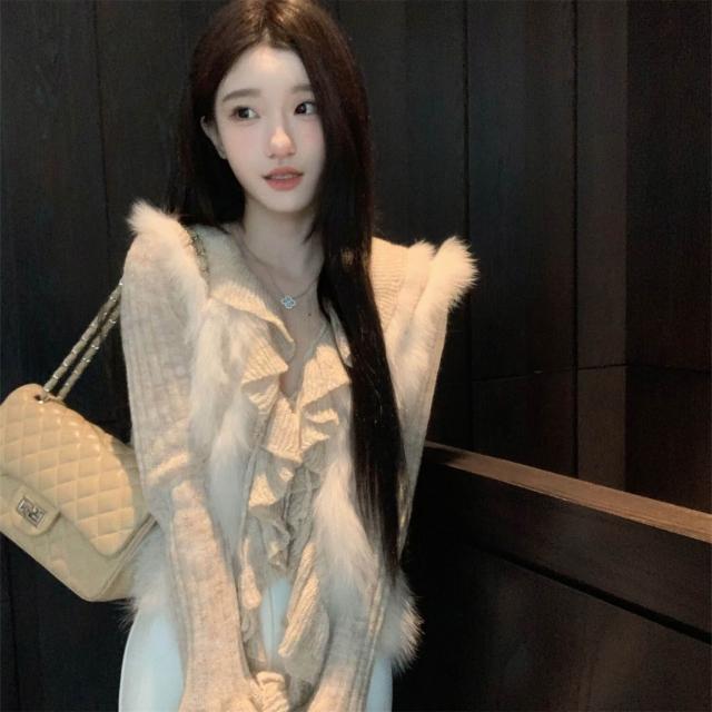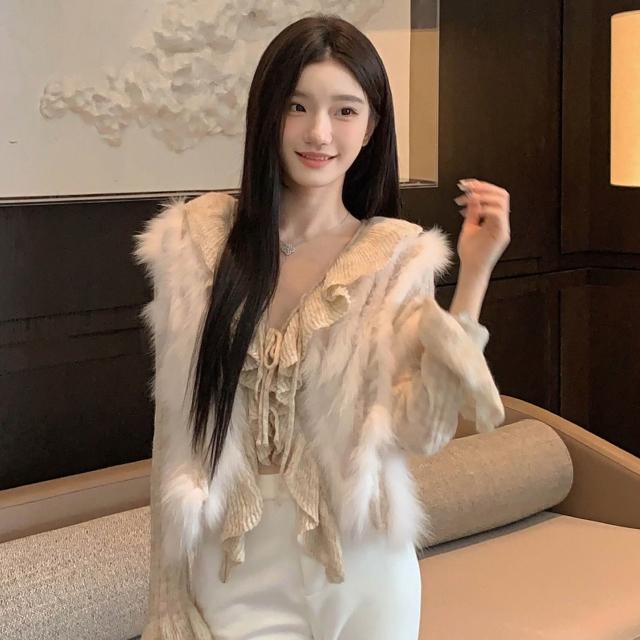 漫語· 溫柔毛毛拼接荷葉邊女羊毛針織開衫百搭上衣