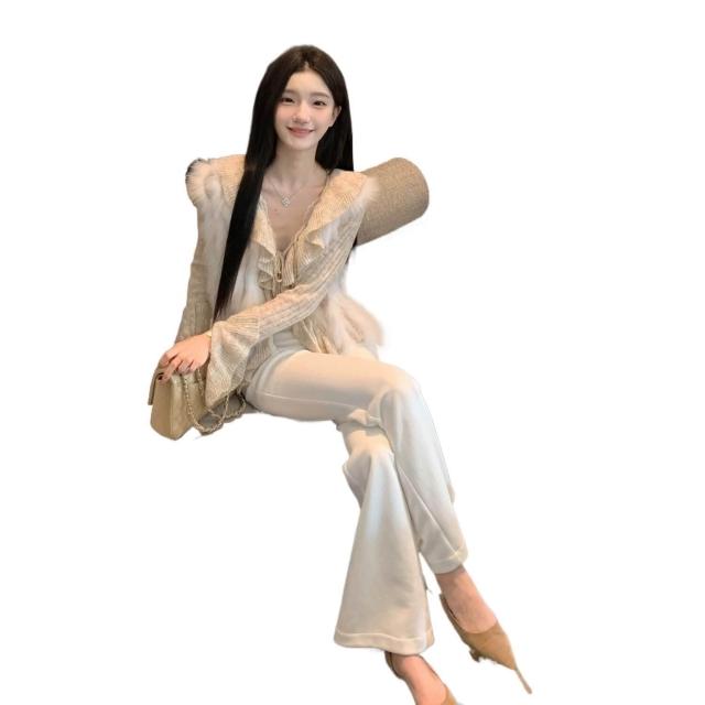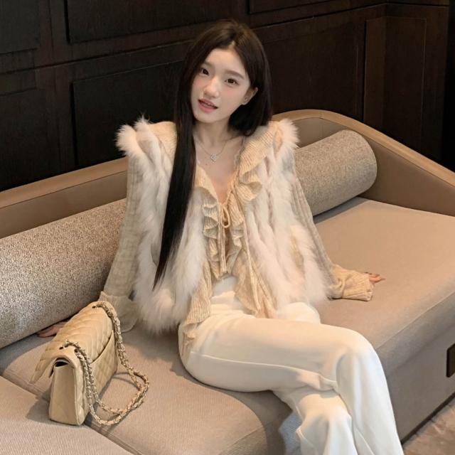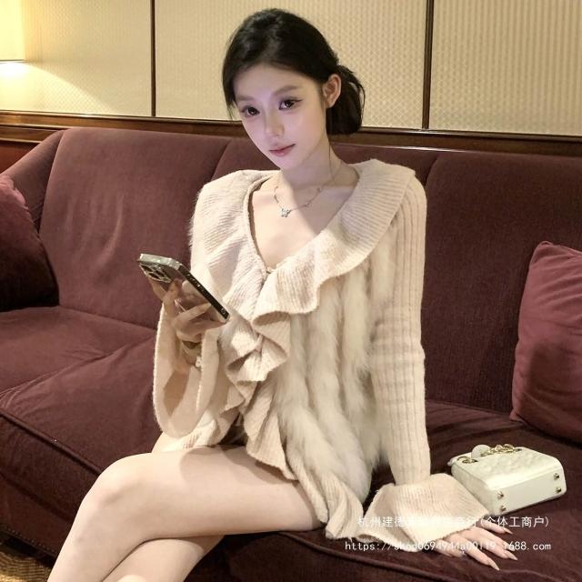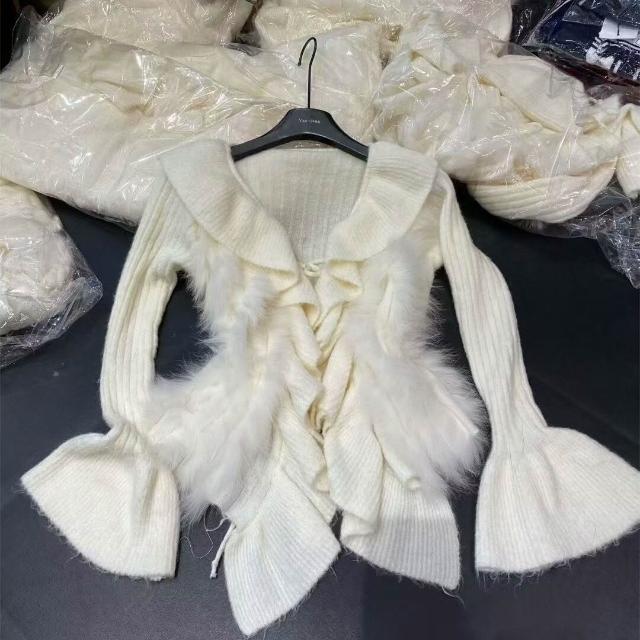 漫語· 溫柔毛毛拼接荷葉邊女羊毛針織開衫百搭上衣