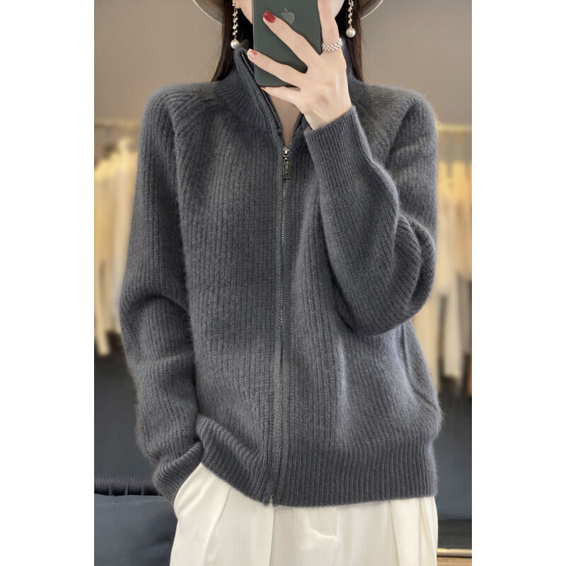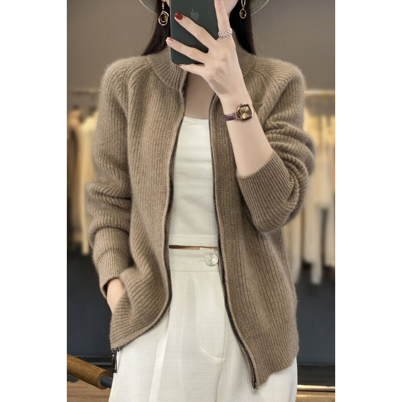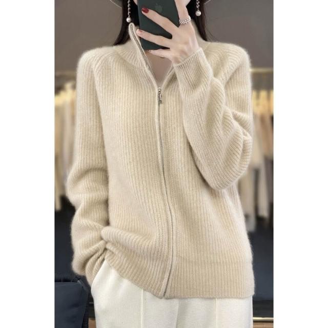 漫語 加厚100%純羊毛開衫外套女寬松慵懶風拉鏈毛衣時尚百搭羊絨針織衫