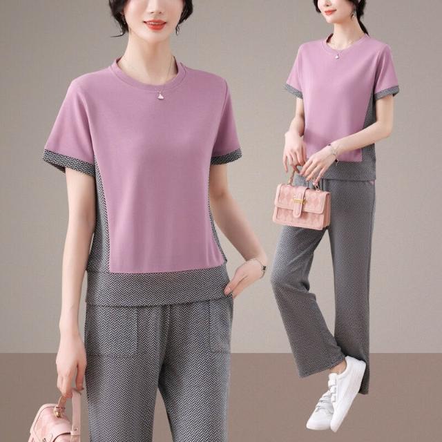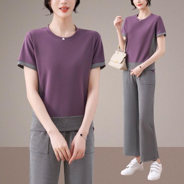 漫語 中年媽媽夏裝套裝中老年女裝洋氣上衣短袖t恤兩件套50歲百搭拼色