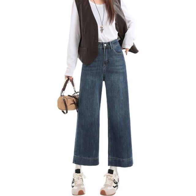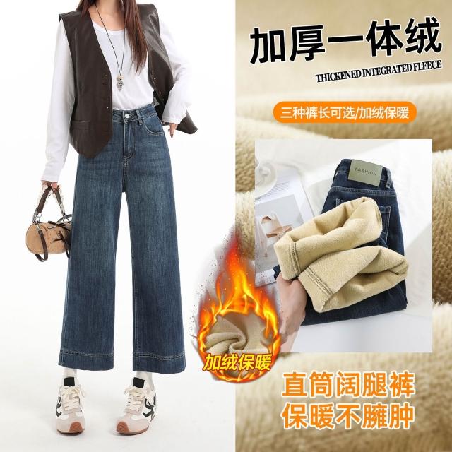 漫語 九分牛仔褲女秋冬加絨保暖小個子高腰窄版闊腿奶奶褲百搭直筒褲子