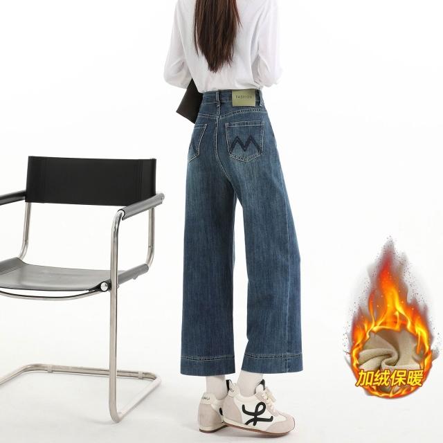 漫語 九分牛仔褲女秋冬加絨保暖小個子高腰窄版闊腿奶奶褲百搭直筒褲子