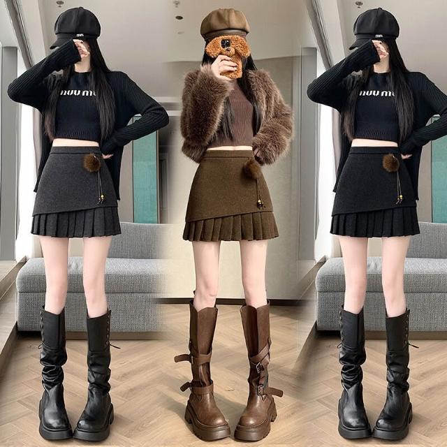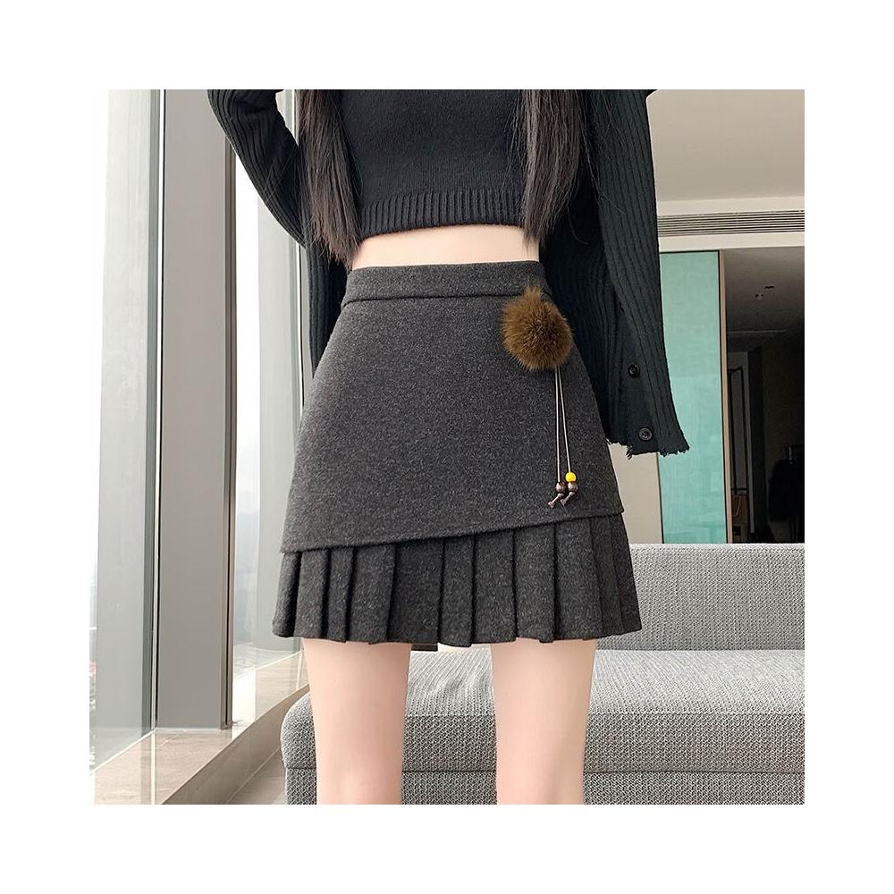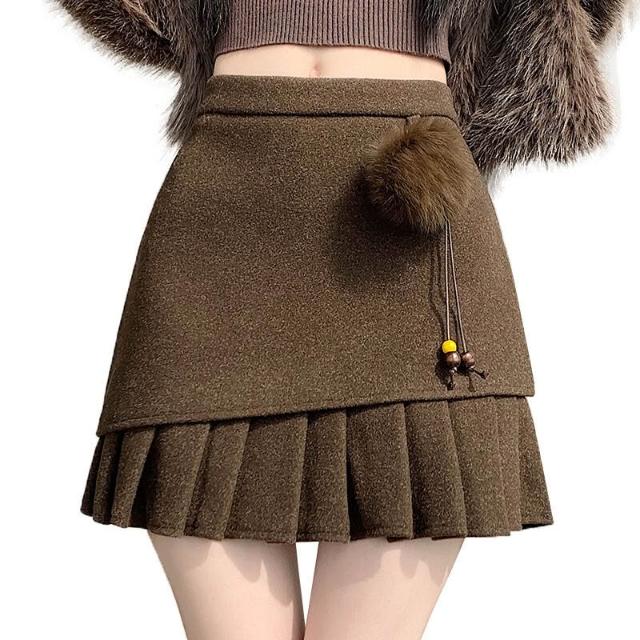 漫語 實拍秋冬新款毛呢百褶立體毛球掛飾半身裙A字裙