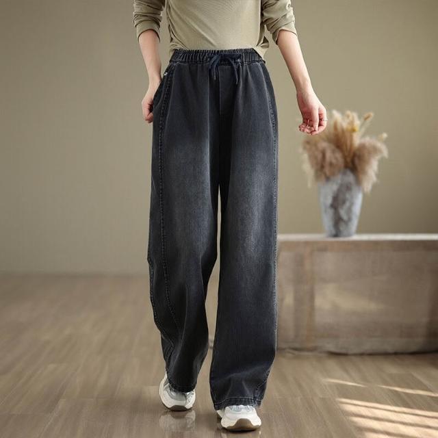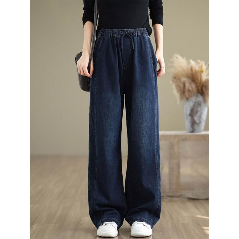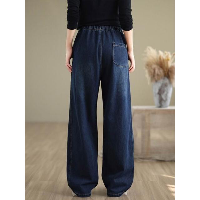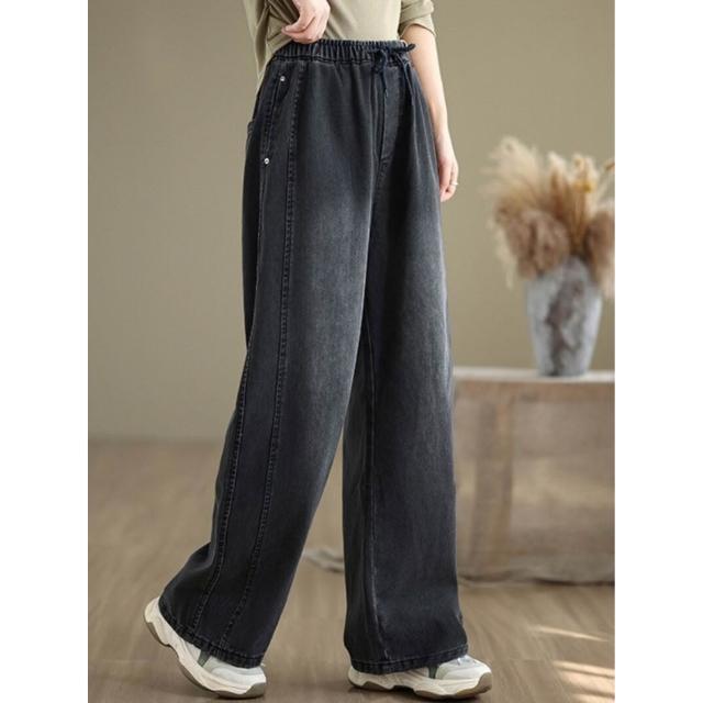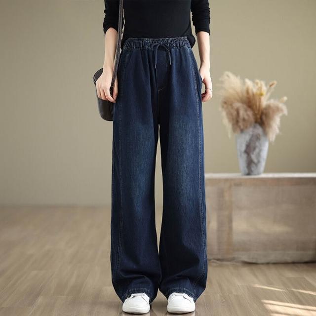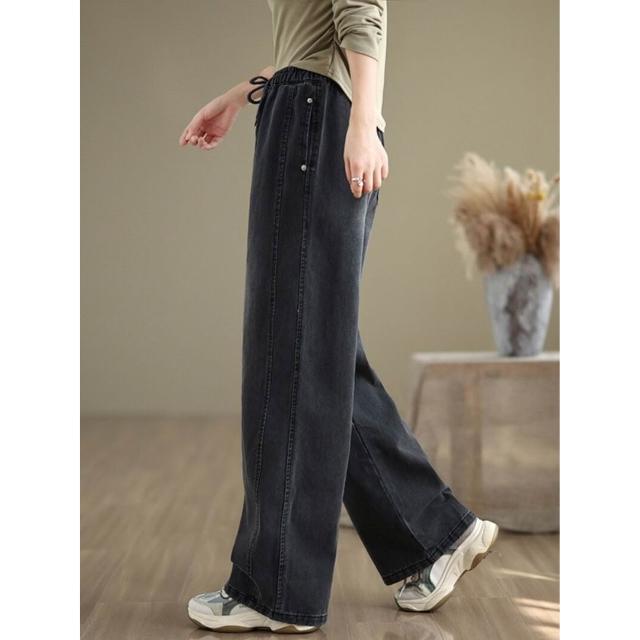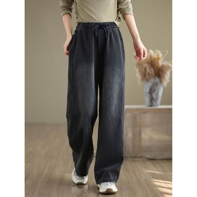 漫語 復古大碼休閑松緊腰牛仔褲女春秋新款寬松百搭直筒闊腿褲顯瘦長褲