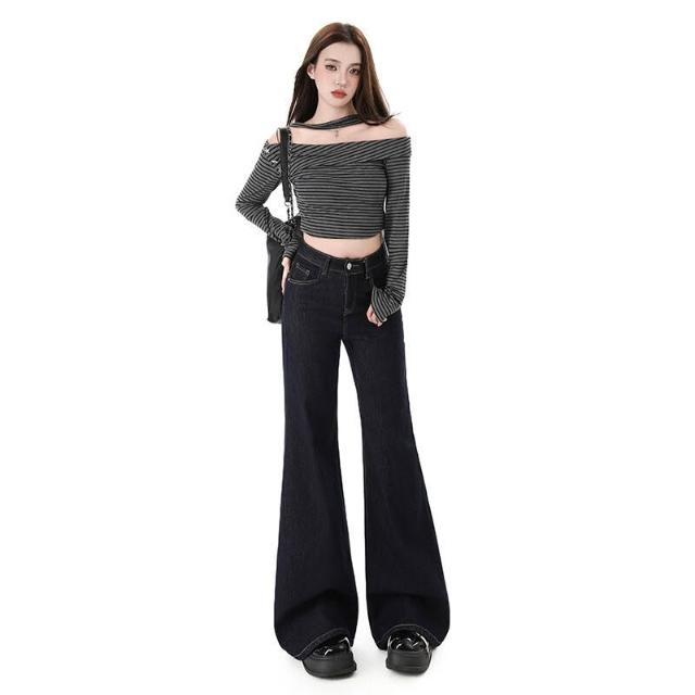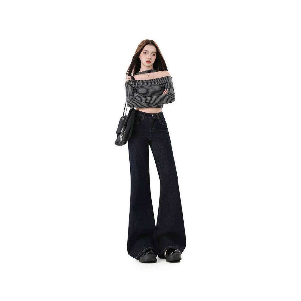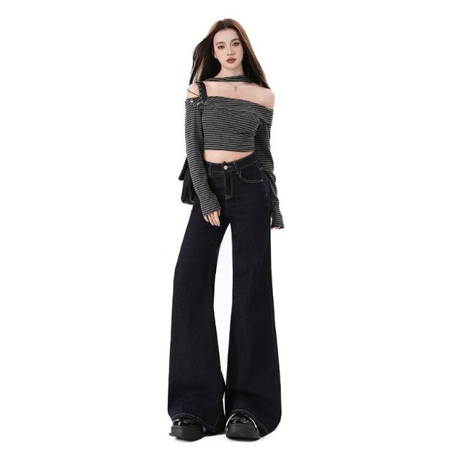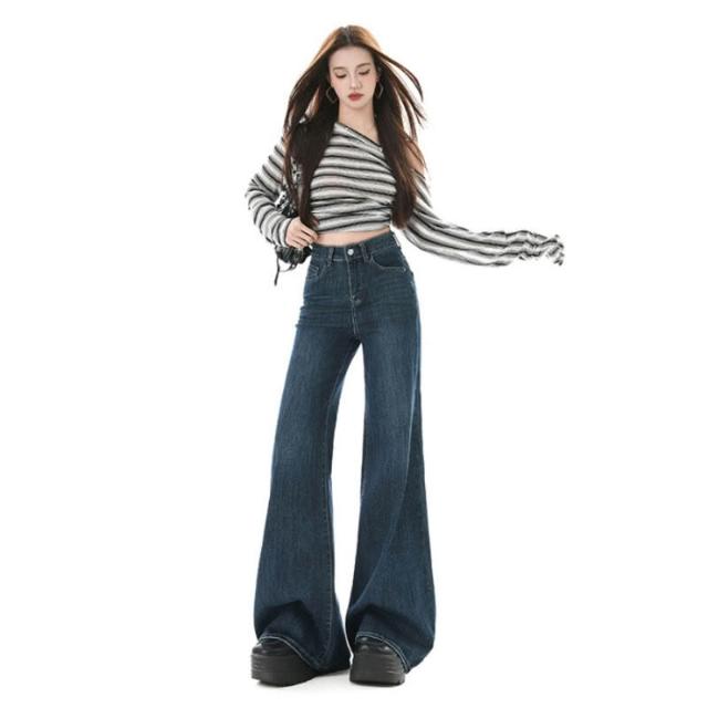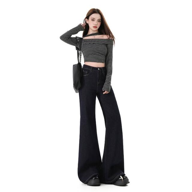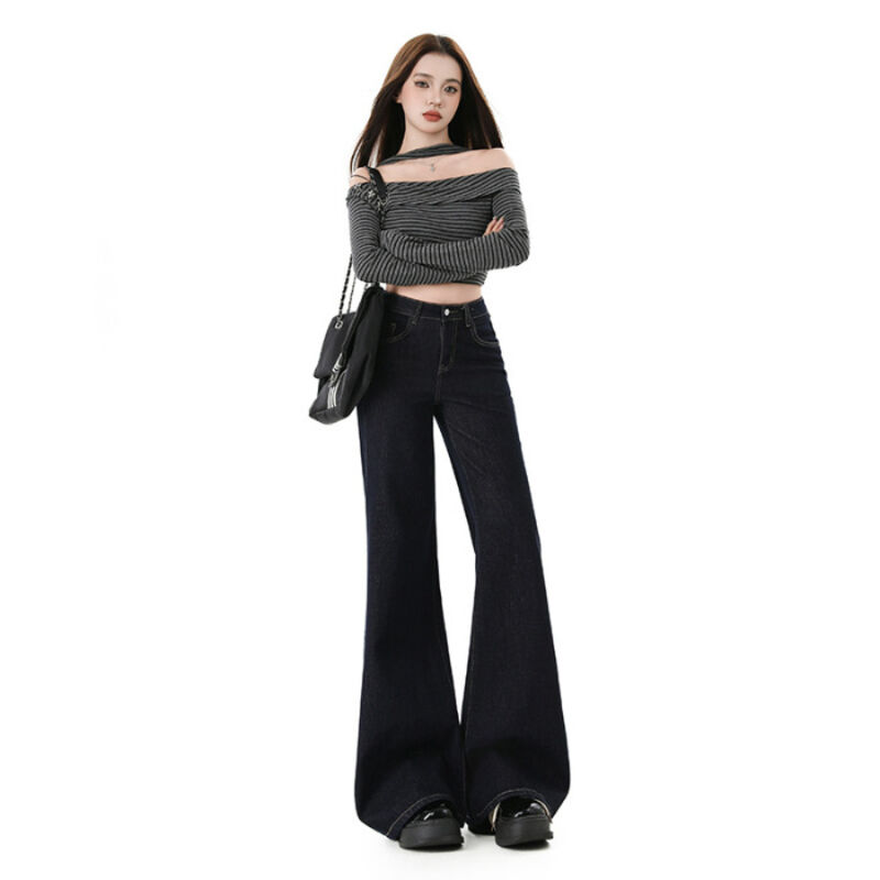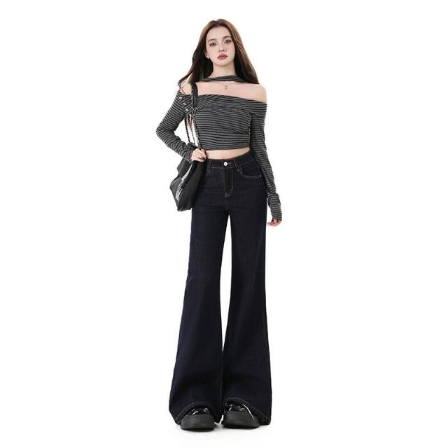 漫語 高腰不貼腿美式寬松微喇牛仔褲女加絨新款顯瘦彈力春秋拖地喇叭褲