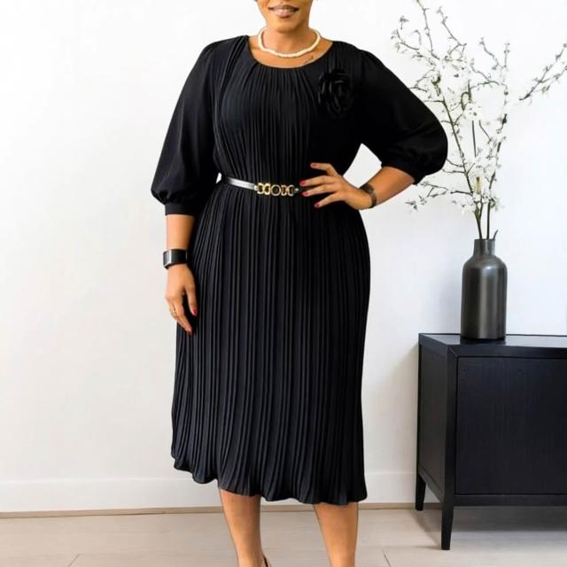漫語 D614外貿女裝2026新款夏七分袖圓領純色時尚簡約收腰中長款連衣裙