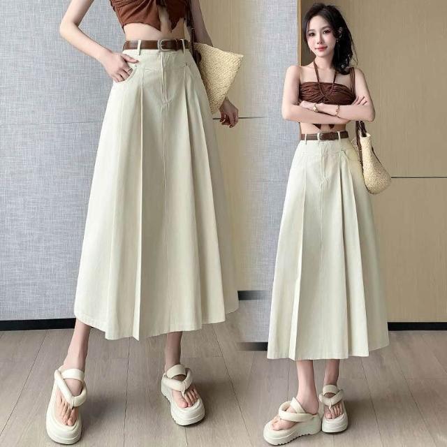 漫語 中長款半身裙女2026春夏新款高腰A字大擺OL過膝牛仔傘裙百褶長裙
