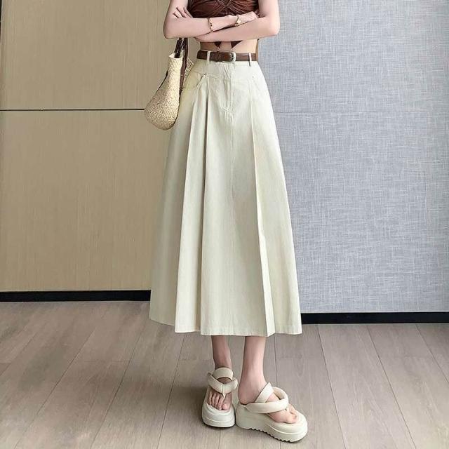 漫語 中長款半身裙女2026春夏新款高腰A字大擺OL過膝牛仔傘裙百褶長裙