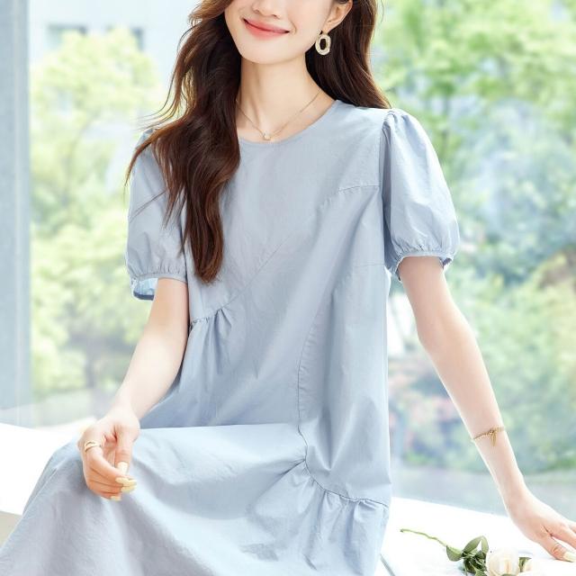 漫語 藍色泡泡袖連衣裙女2026夏新款寬松顯瘦設計感小眾薄款裙子