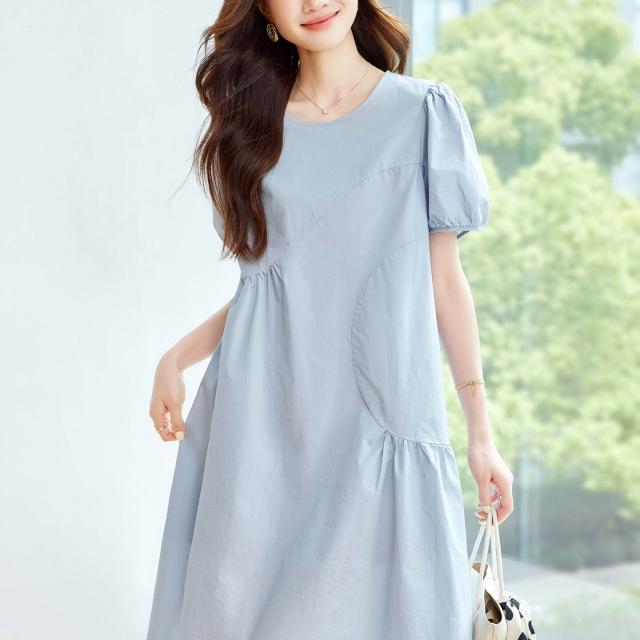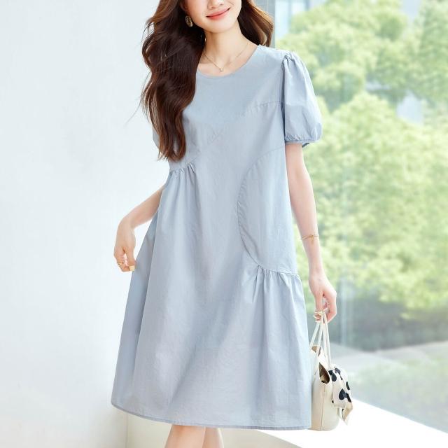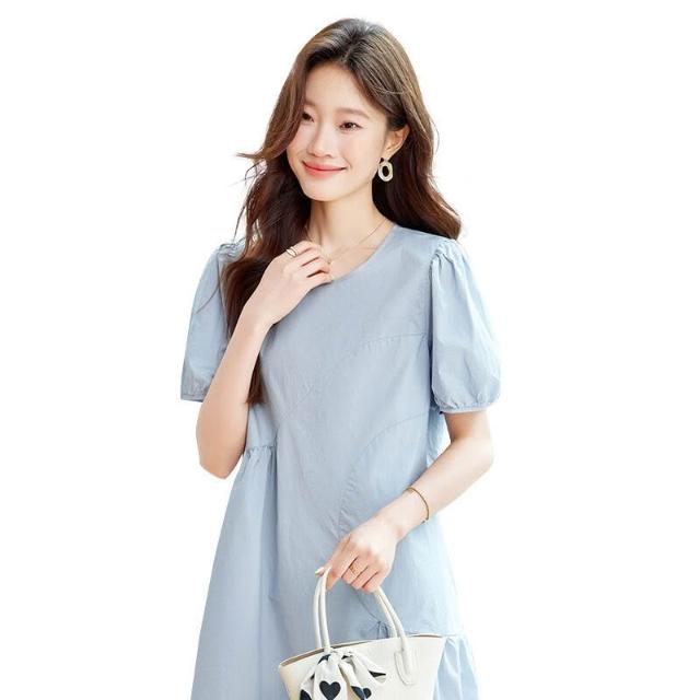 漫語 藍色泡泡袖連衣裙女2026夏新款寬松顯瘦設計感小眾薄款裙子
