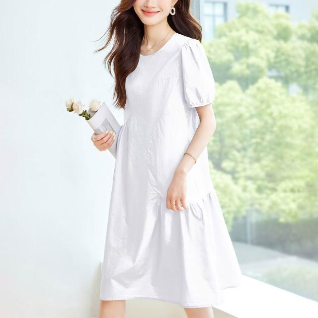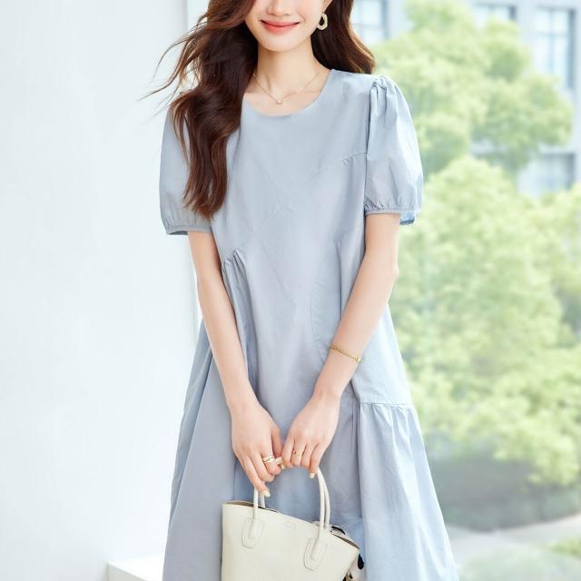 漫語 藍色泡泡袖連衣裙女2026夏新款寬松顯瘦設計感小眾薄款裙子