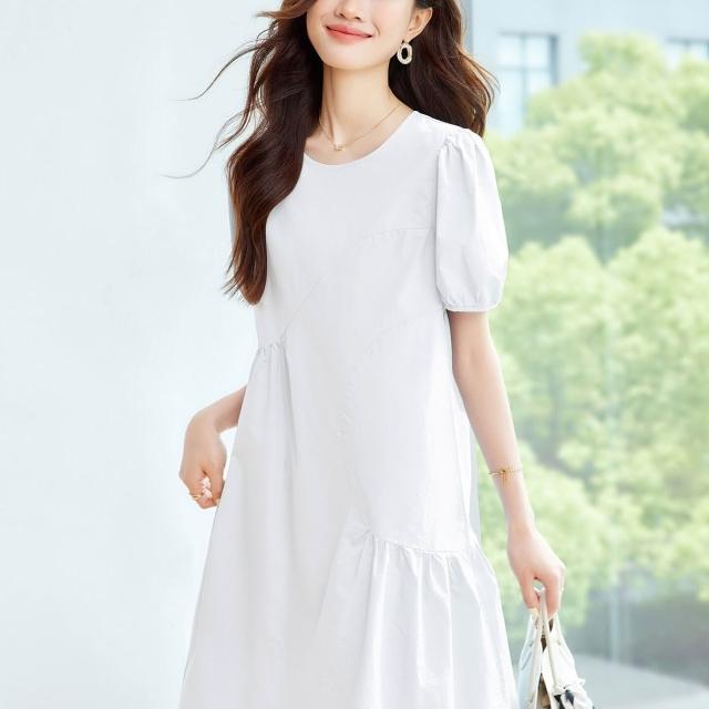 漫語 藍色泡泡袖連衣裙女2026夏新款寬松顯瘦設計感小眾薄款裙子