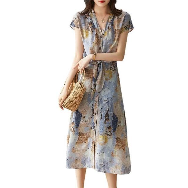 漫語 真絲裙子2026夏季新款女裝V領桑蠶絲短袖中長款碎花連衣裙優雅