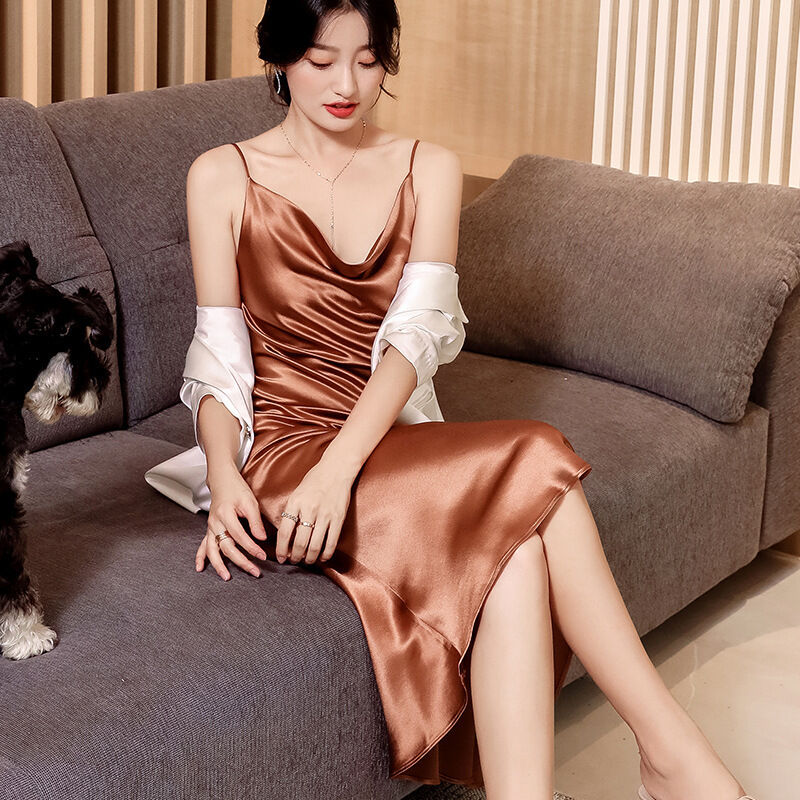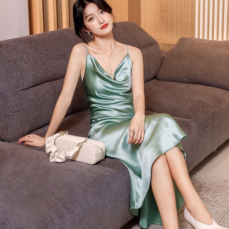 漫語 2026春夏新款長裙醋酸緞面吊帶蕩領45度斜裁網紅爆款綠色連衣裙女