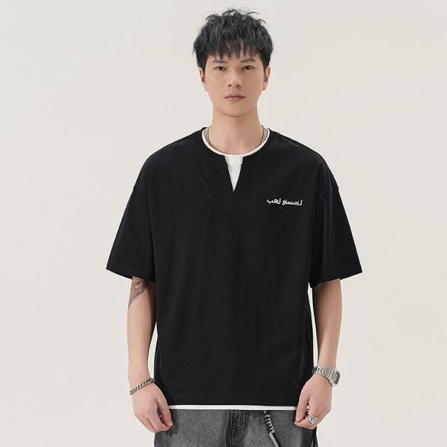 漫語 2026夏季新款假兩件V領短袖T恤男寬松休閑半袖衫純棉紅色印花上衣