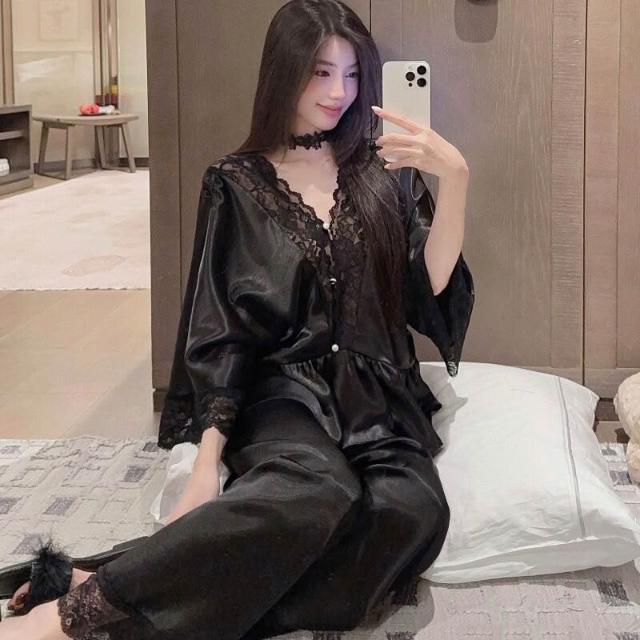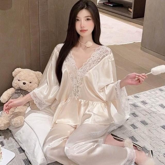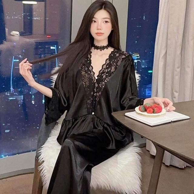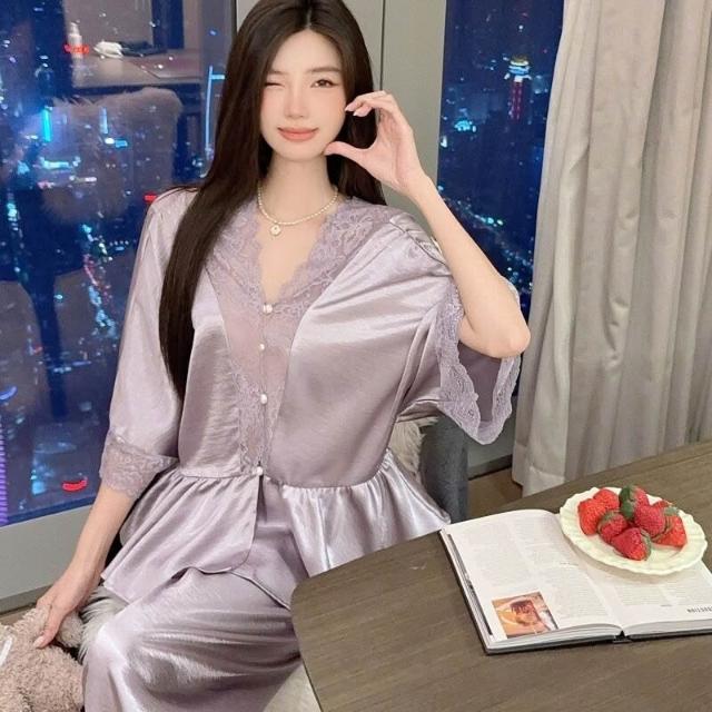 漫語 跨境新中式提花可愛睡衣套裝冰絲可外穿家居服玫瑰花仿醋酸睡衣女