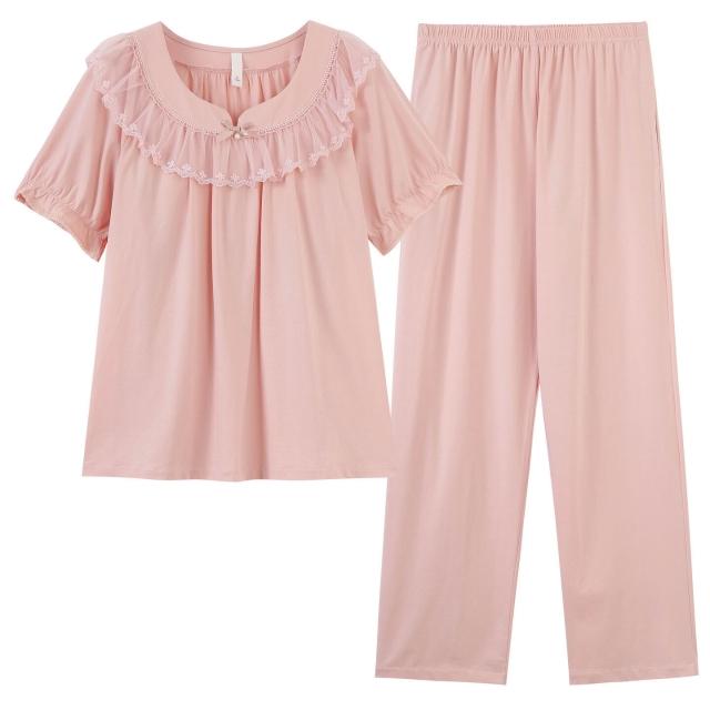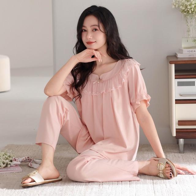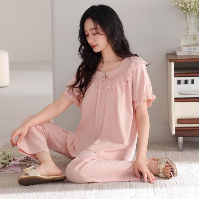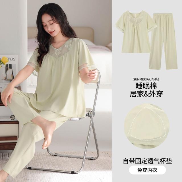 漫語 2026新款帶胸墊睡衣女士純棉短袖長褲夏季薄款休閑柔軟家居服套裝
