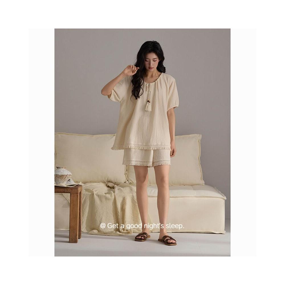 漫語 A類雙層紗2026夏全棉女士睡衣古風簡約棉紗流蘇侘寂風家居服a