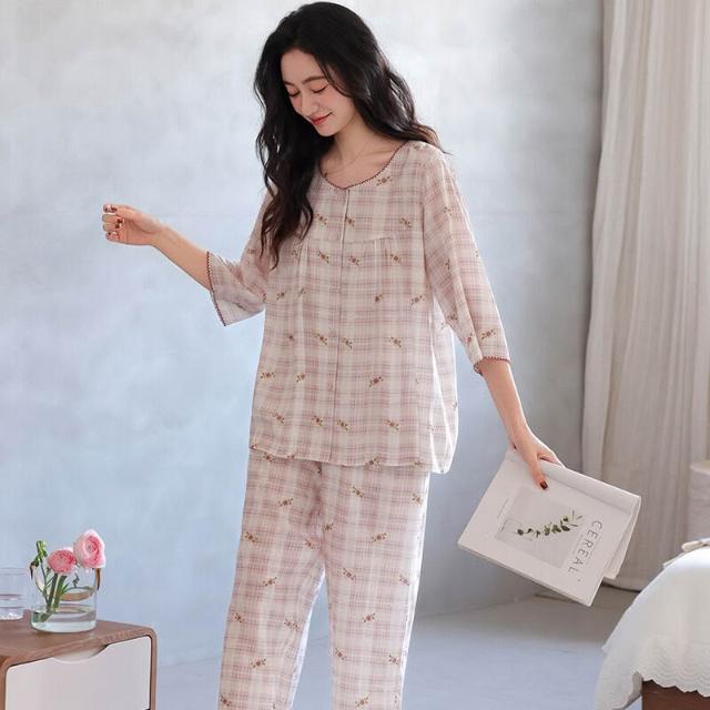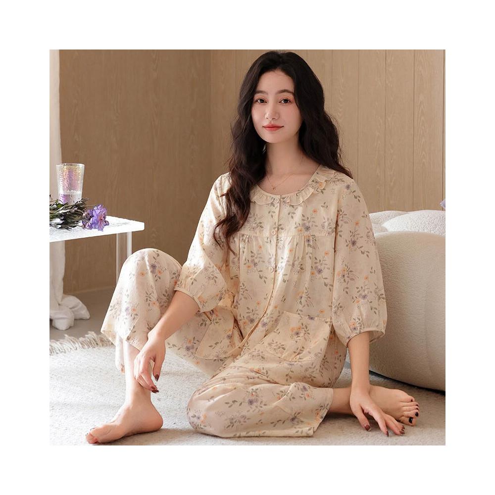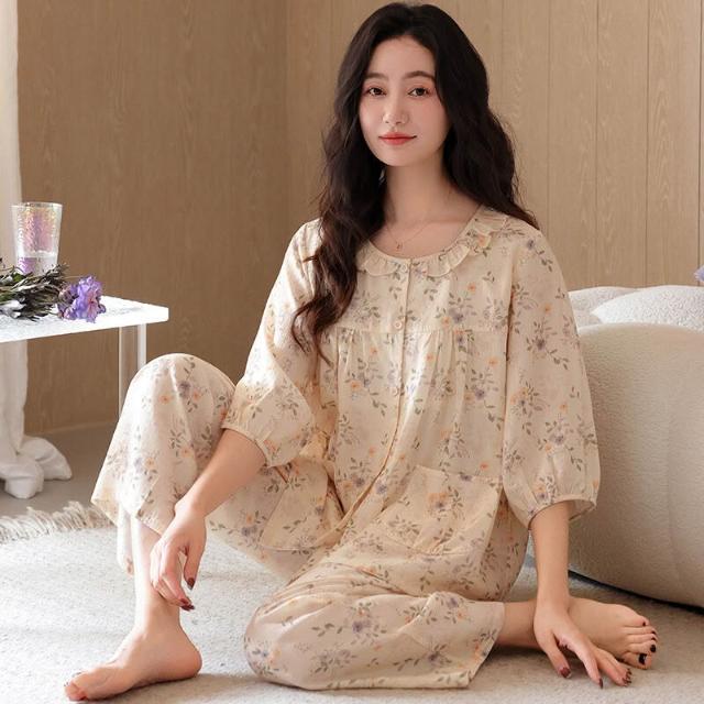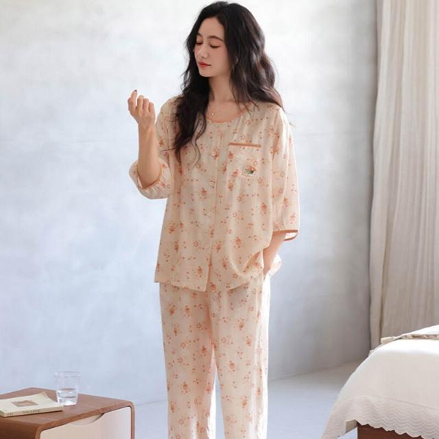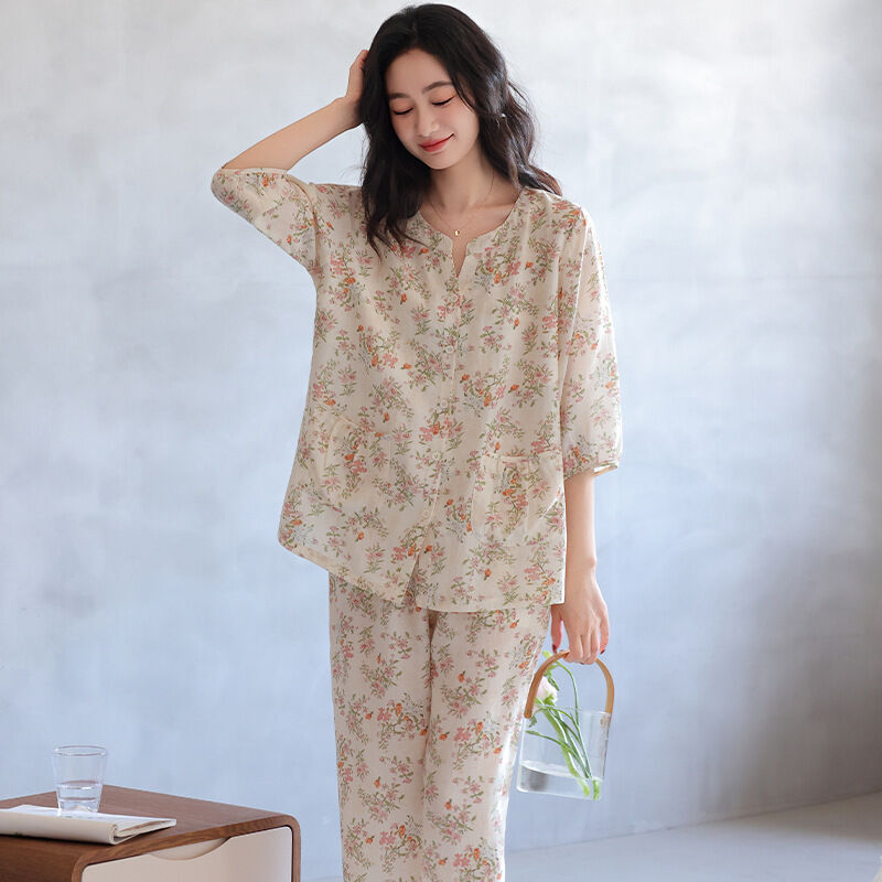 漫語 夏季七分袖睡衣女舒適柔軟萊賽爾開衫薄款甜美印花家居服休閑套裝