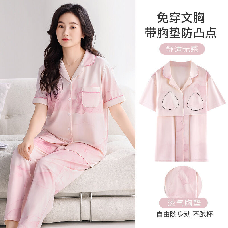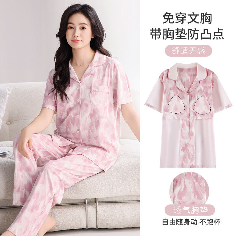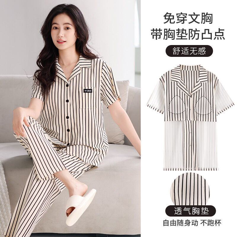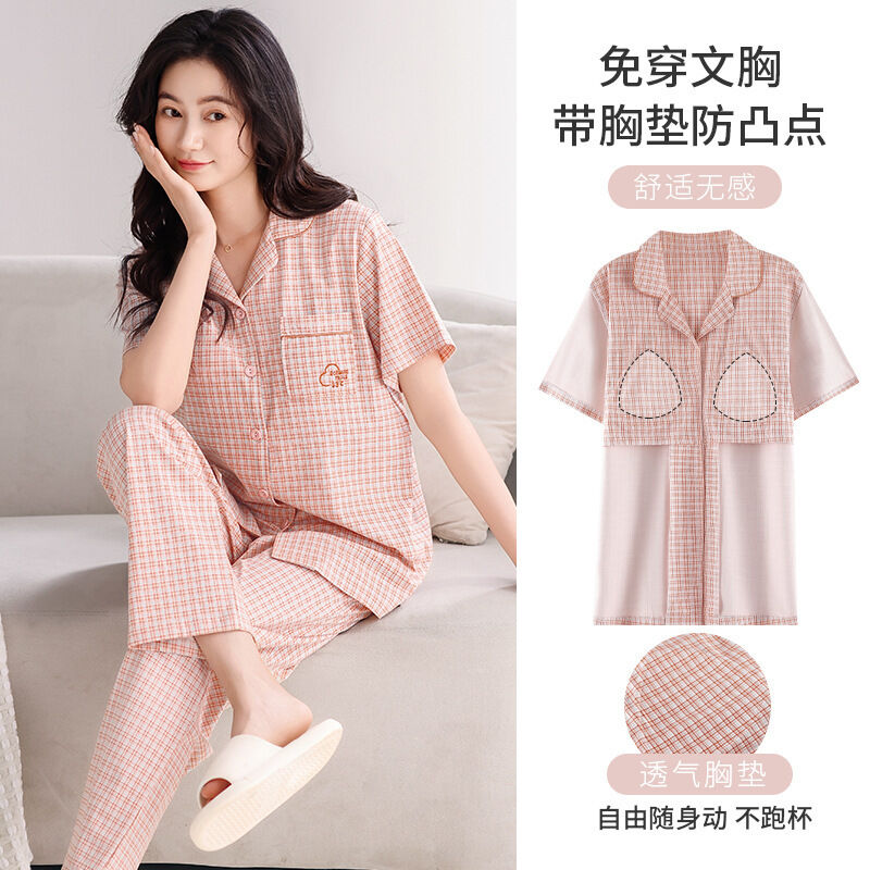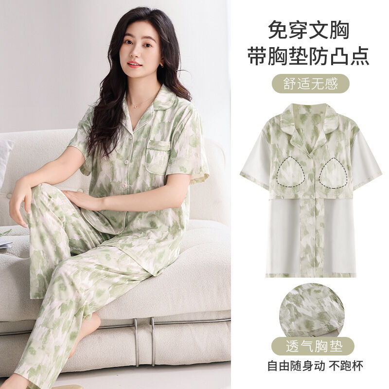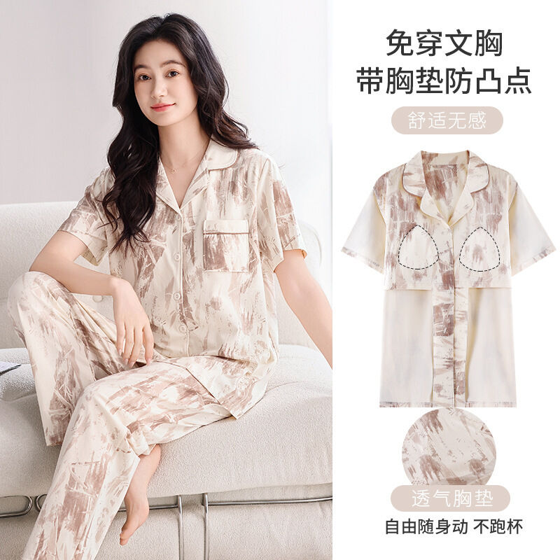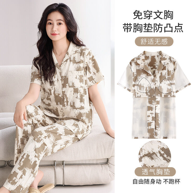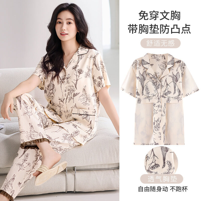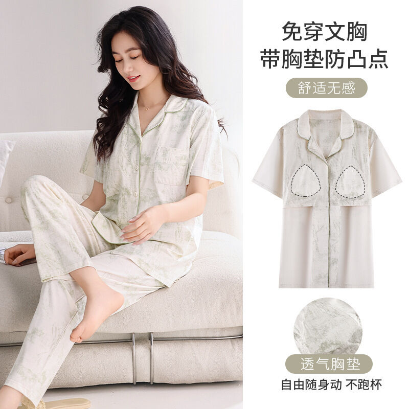 漫語 帶胸墊 睡衣 女士 夏季純棉 短袖 長褲 薄款夏天2026新款夏款開衫 家居服