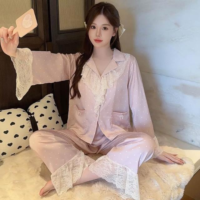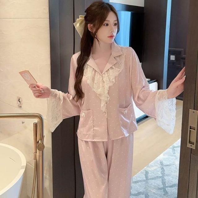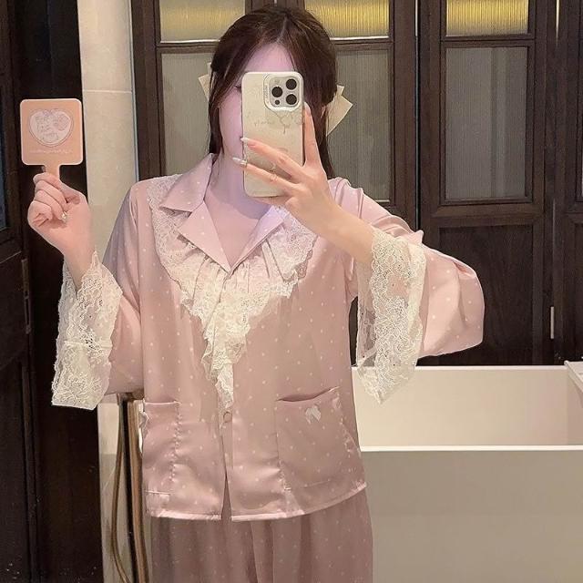 漫語 新款 睡衣 女春秋季波點蕾絲冰絲 長袖 長褲 性感可 外穿 家居服 套裝