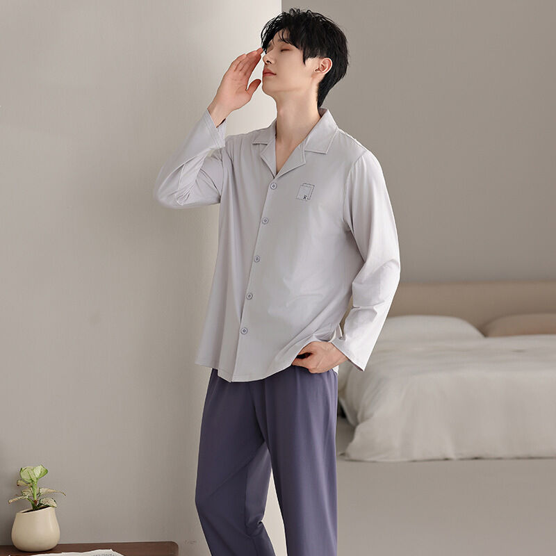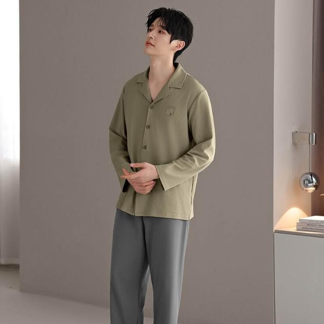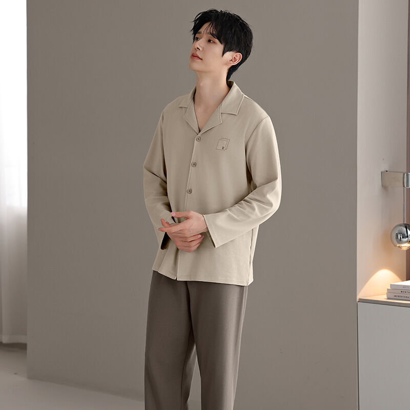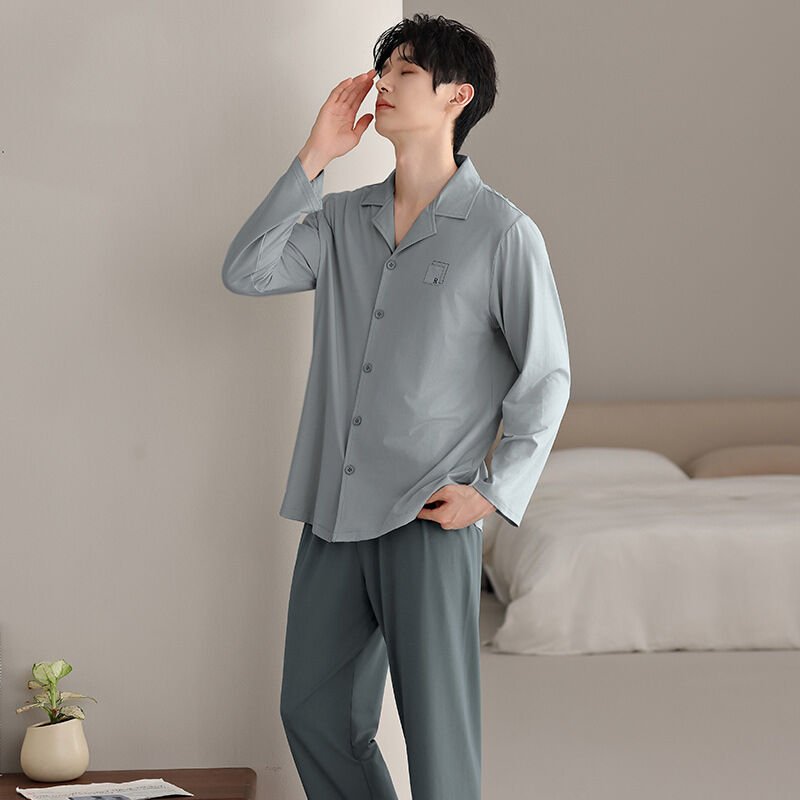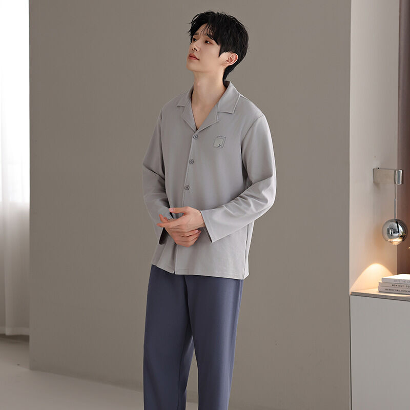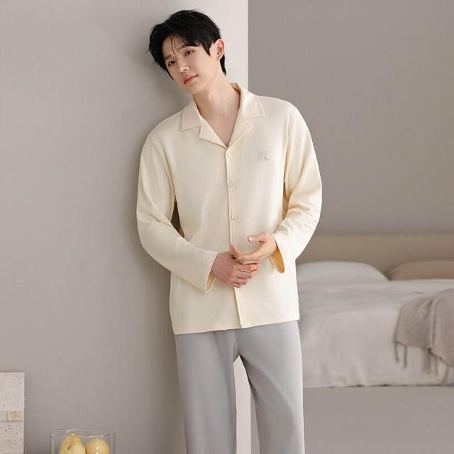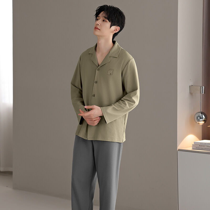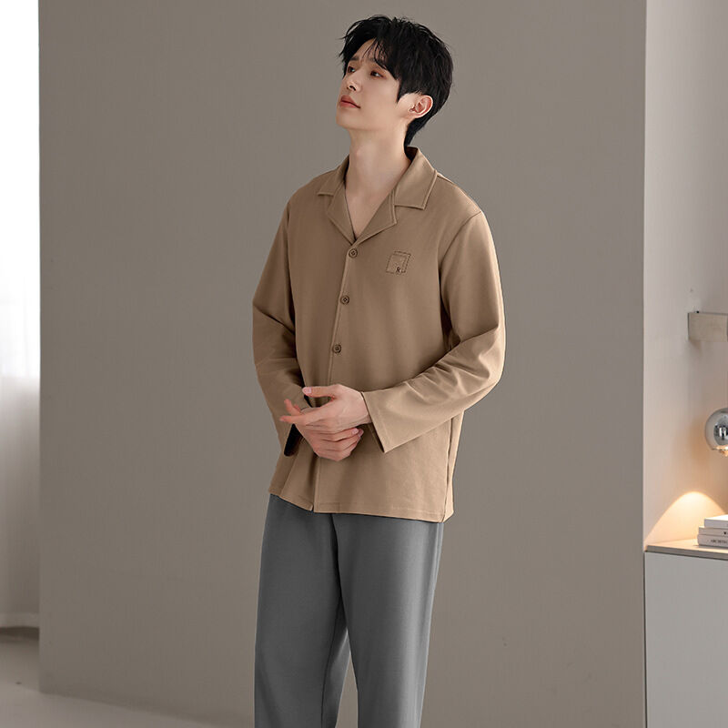 漫語 2026新款男士 睡衣 純棉開衫 長袖 簡約舒適休閑純色春秋季男士 家居服