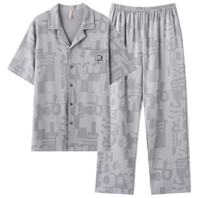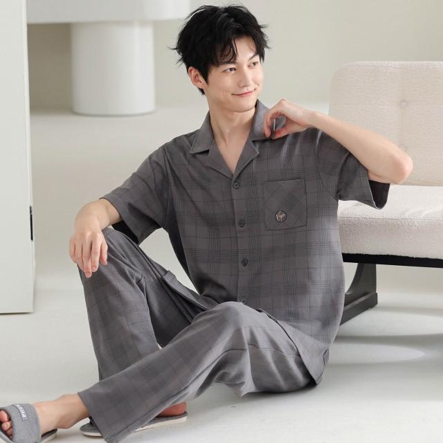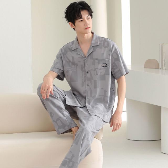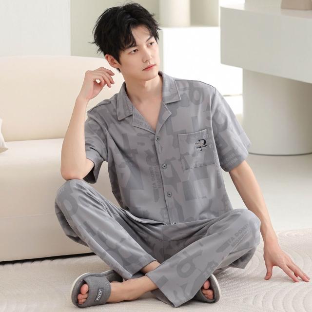 漫語 夏季2026新款純棉男士睡衣開衫翻領短袖長褲大碼家居服三件套套裝