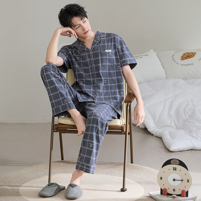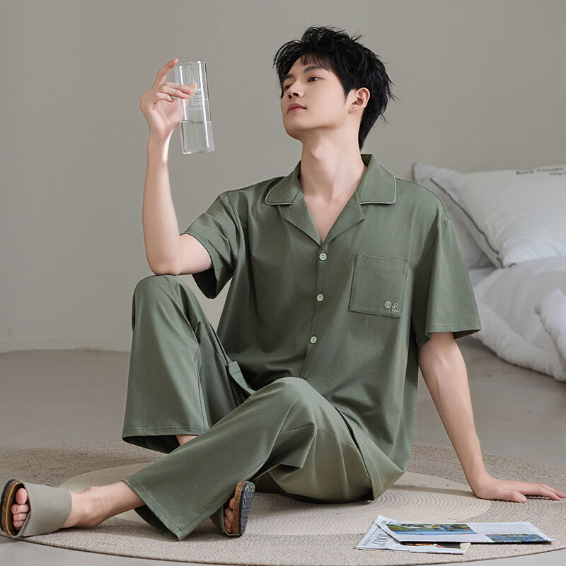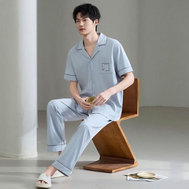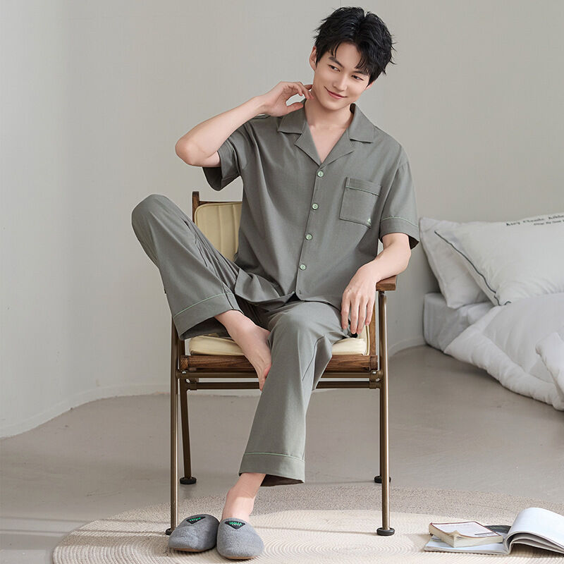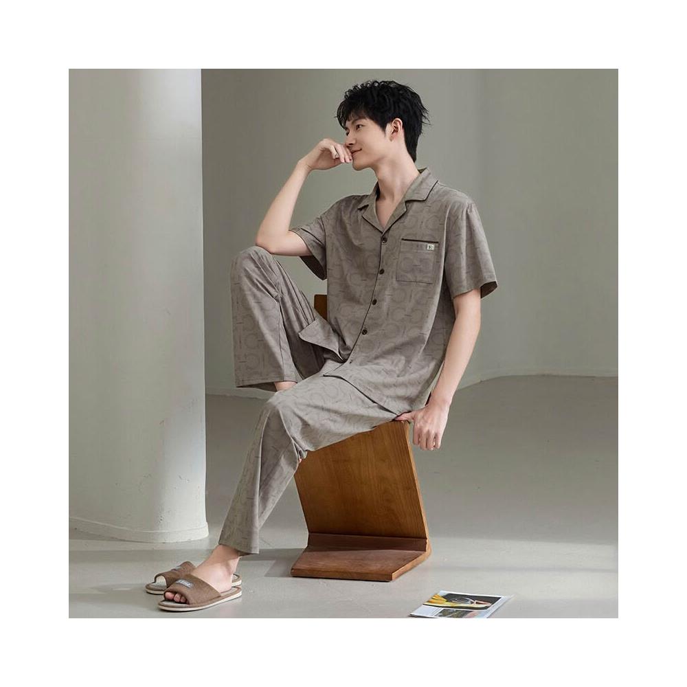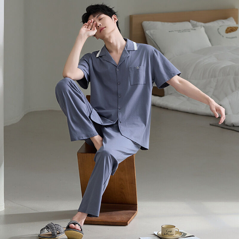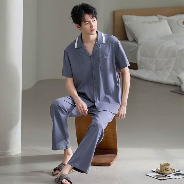 漫語 睡衣男夏季純棉短袖長褲男士薄款夏天大碼半袖男款夏款家居服套裝