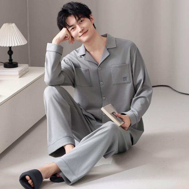 漫語 春秋季拉架純棉 睡衣 男士簡約休閑純色翻領 家居服 寬松大碼青年套裝