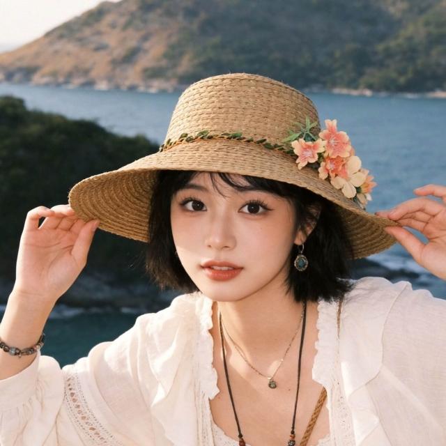 漫語 帽子女2026新款夏季花朵草帽海邊度假沙灘帽甜美大帽檐遮陽防曬帽
