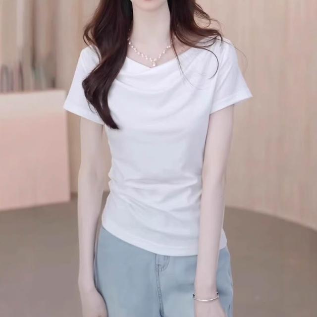 漫語 蕩領棉短袖t恤女2025夏季新款大碼胖MM正肩顯一字肩上衣百搭