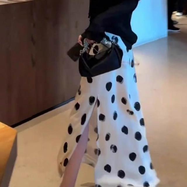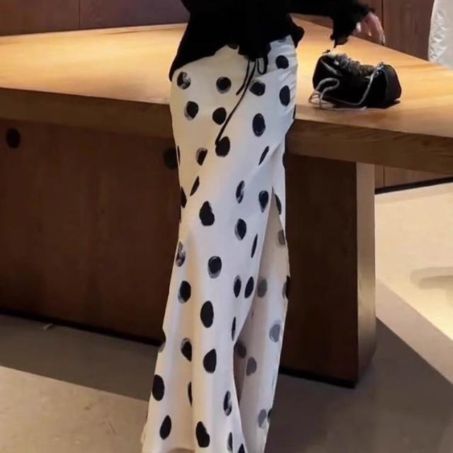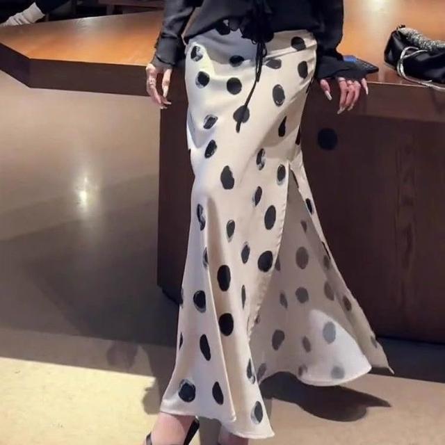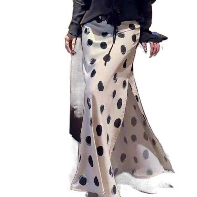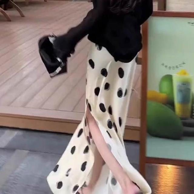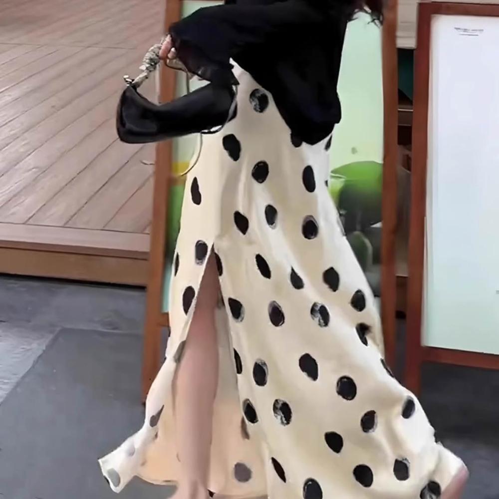 漫語 緞面波點開叉半身裙女夏秋大碼胖mm高級感百搭氣質顯瘦長裙