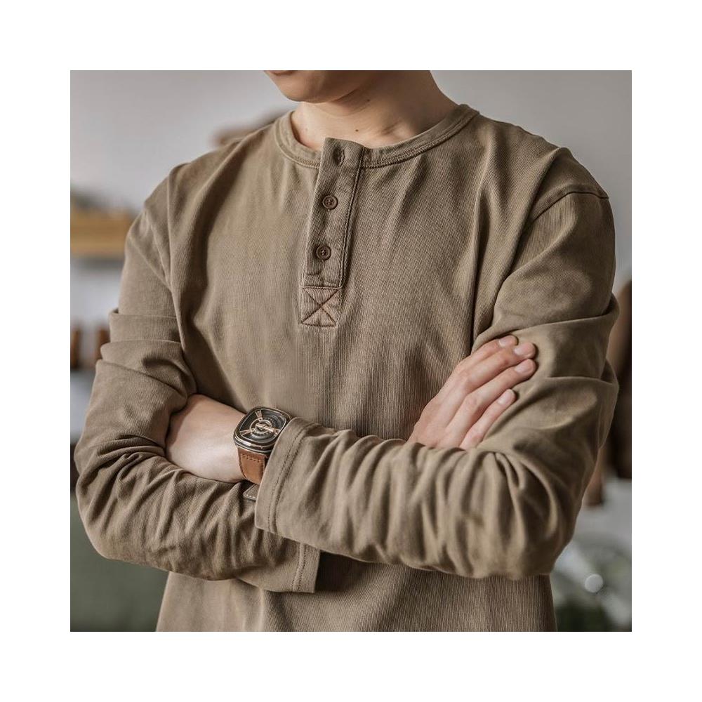美式複古亨利衫T卹男春秋大碼150.0kg硬漢寬鬆開領長袖打底衫上衣潮