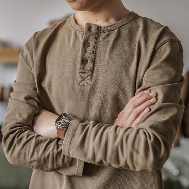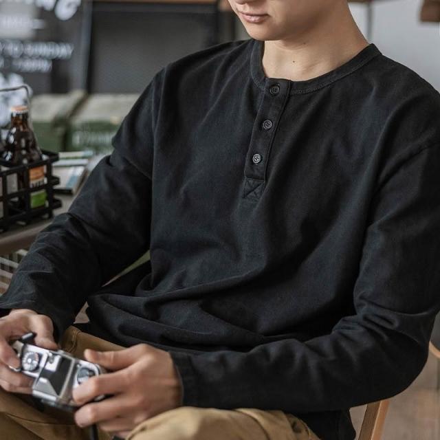 美式複古亨利衫T卹男春秋大碼150.0kg硬漢寬鬆開領長袖打底衫上衣潮