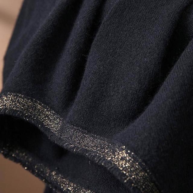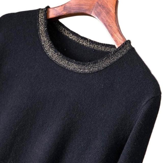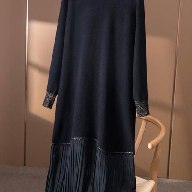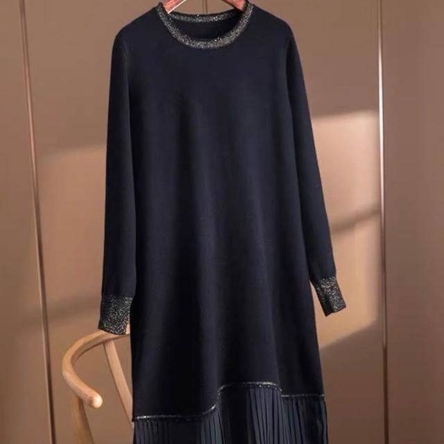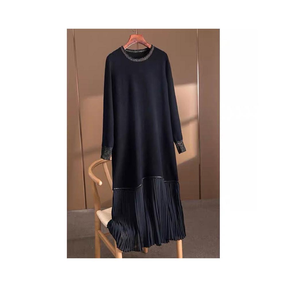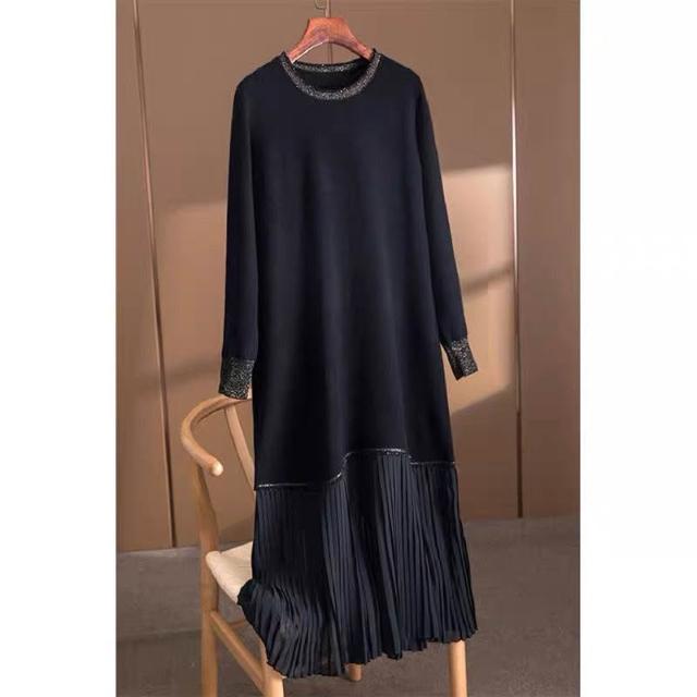 大碼女裝春秋新款洋氣減齡毛衣連衣裙顯瘦遮肉百褶長袖打底裙黑色