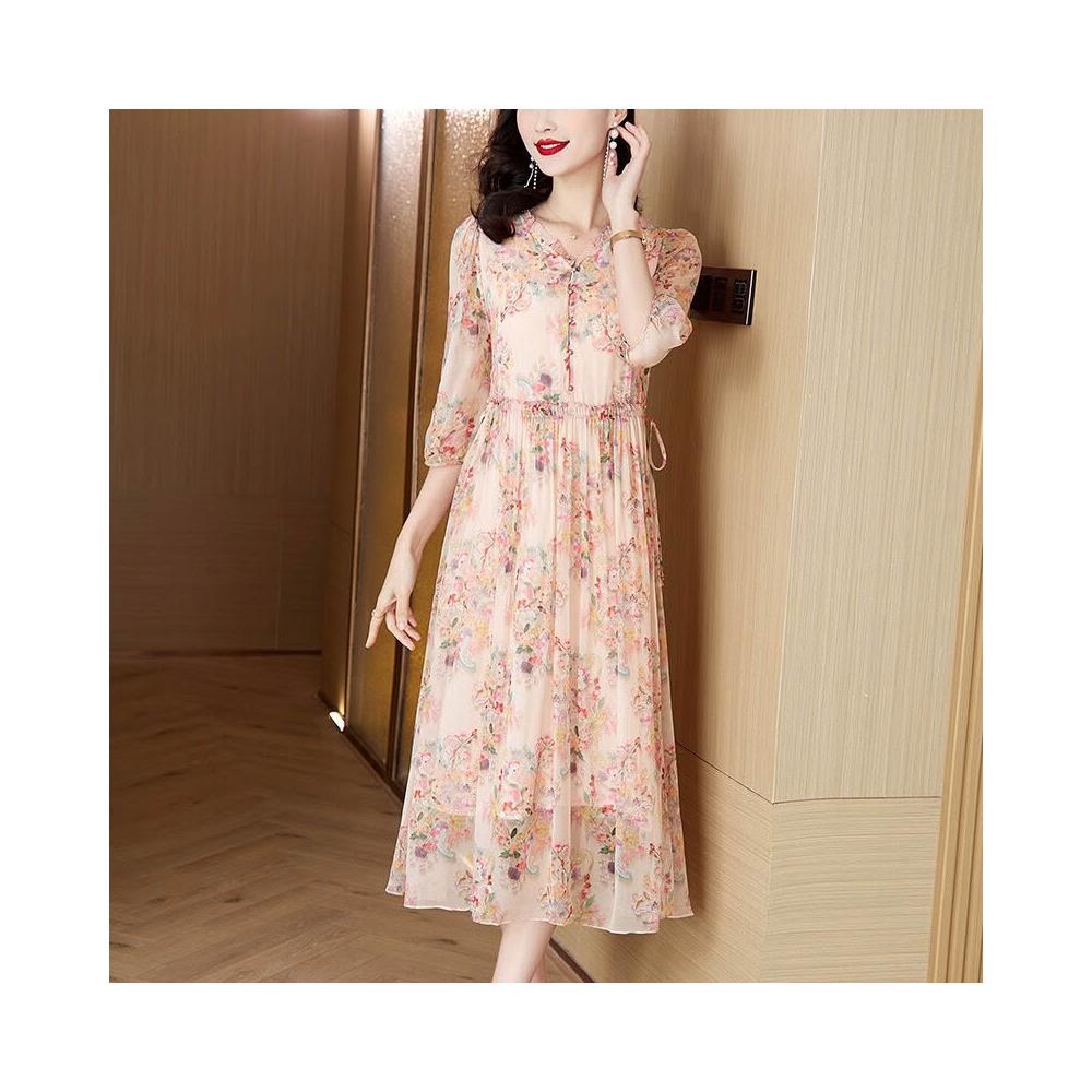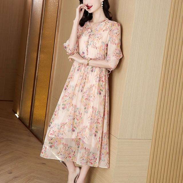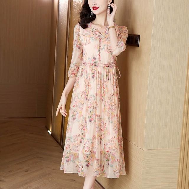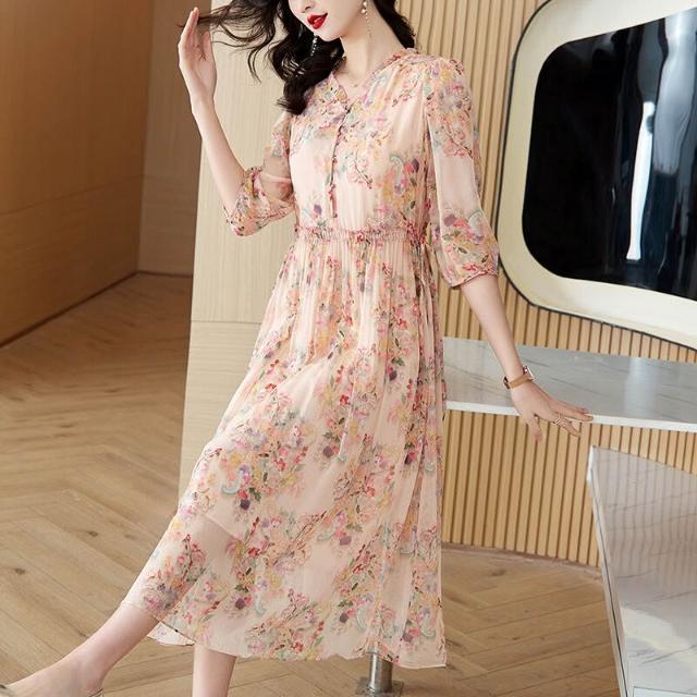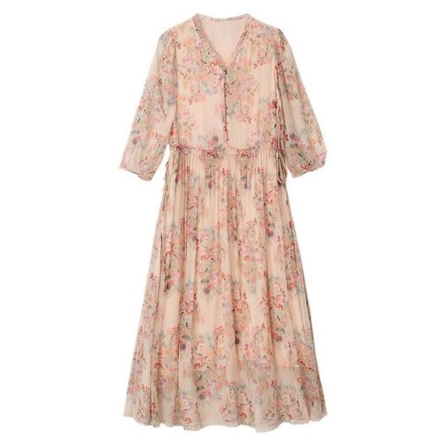 高品質清爽大碼遮肚減齡中年女真絲連衣裙氣質碎花重磅桑蠶絲長裙